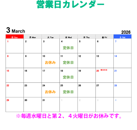 定休日 毎週水曜日、第2・4火曜日